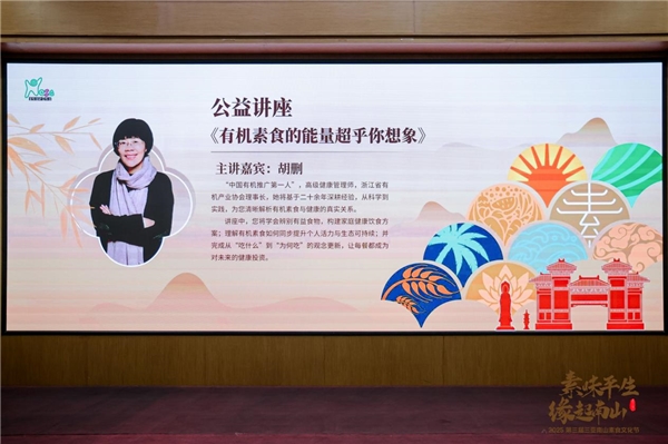2025年12月17日下午,作为2025第三届三亚南山素食文化节的重要知识板块,一场主题为《有机素食的能量超乎你想象》的公益演讲在南山景区休闲会馆内举行。被誉为“中国有机推广第一人”的胡删老师亲临现场,以其二十余年深耕有机健康领域的丰富经验,为线上线下观众带来了一场融合科学、健康与生活智慧的思想盛宴。