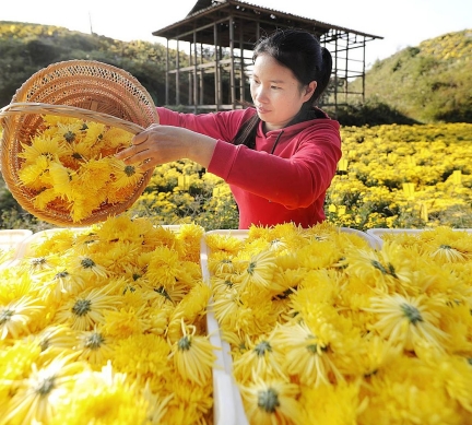 图为10月22日,村民在金丝皇菊种植基地整理采摘下来的鲜花。