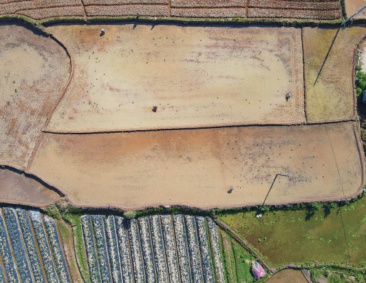 图为村民正在稻田里插秧(无人机拍摄)。