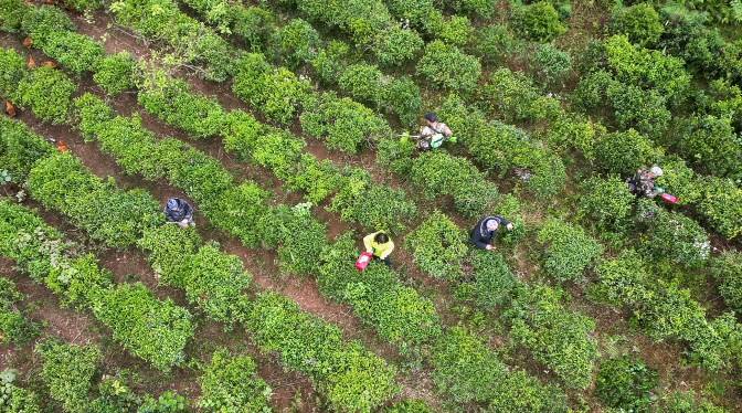 图为近日,林场茶园员工为茶树整枝除草(无人机照片)。