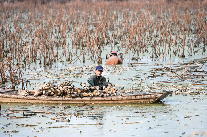 图为近日,在浠水县策湖莲藕种植基地,藕农正在采收鲜藕。