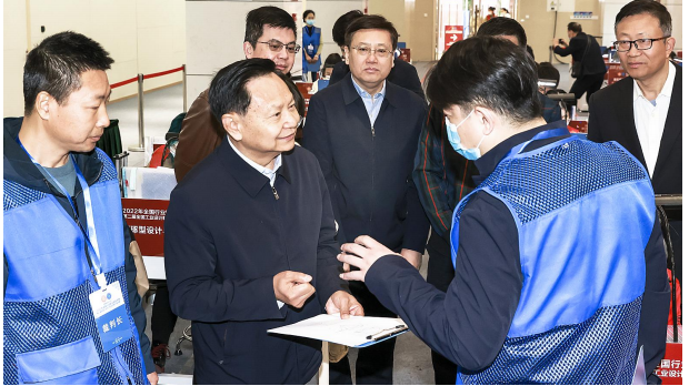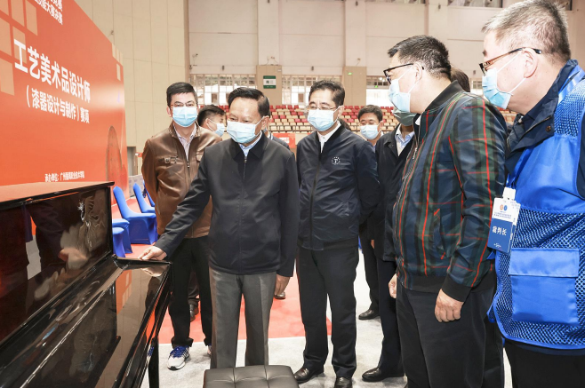 张崇和一行先后来到宝石琢磨工(宝石琢型设计与加工)、工艺美术品设计师(漆器设计与制作)和室内装饰设计师(室内陈设与空间设计)三大赛项决赛现场,听取了各赛项裁判长对参赛人数、比赛时长、比赛规程以及评分制度的介绍,详细了解了大赛情况,并对各赛项提升赛程规范水平、加快选手设计成果转化、推动轻工行业高质量发展提出意见。