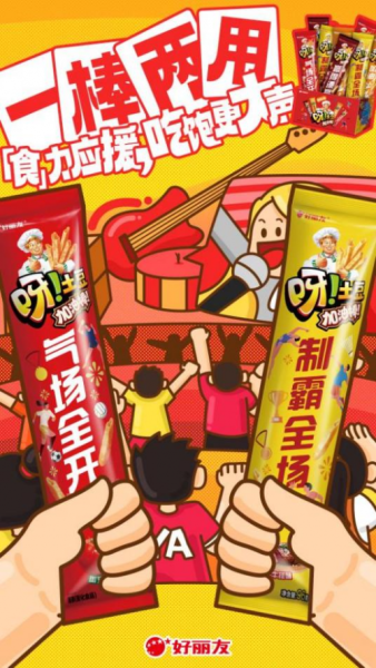 在线下,好丽友配合本次“暑期嗨翻天”主题营销,对“呀!土豆”与“蘑古力”进行了全新的视觉升级:在社交网络日益普及的今天,消费者越来越注重产品是否具有“晒圈”价值,脱胎于龙年限定“加油棒”造型的“呀!土豆”新包装,采用了“应援棒”的设计思路,可吃可玩的“加油棒”更容易在社交媒体上引发分享热潮。在聚会或派对上,消费者在享受美味的同时,还能通过挥舞“应援棒”式的包装,成为氛围担当。“呀!土豆”新包装从场景出发,赋予产品全新的功能性,从而在情感和社交层面为消费者提供额外的价值。