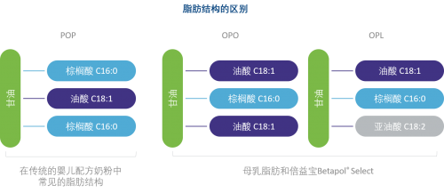 倍益宝Betapol® Select: 高SN-2位棕榈酸甘油三酯含量搭配均衡OPO和OPL(亚油酸位于SN-1或SN-3位)还原中国妈妈天然乳脂成分。