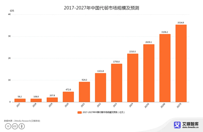 iiMedia Research(艾媒咨询)数据显示,2017-2024年中国代餐市场规模持续增长,2024年中国代餐粉市场规模已达到2210.3亿元,2027年有望达到3534.9亿元。