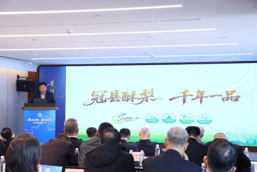 在品牌推介环节,冠县酥梨作为山东省代表性农产品大放异彩。冠县林业局党委书记、局长郭巍峰从历史渊源、自然条件、科技赋能、品牌价值等多维度进行了全面推介。他指出,冠县酥梨种植历史长达2100余年,依托黄河故道沙壤与四季分明气候,形成了“千年梨福地,一品冠酥梨”的独特价值。冠县酥梨以"沁润洌津滟"为品牌之神,以"百果冠梨尊"为品牌之韵,从"产品"升华为"文化符号",从"果品"升华为"生活态度"。目前,冠县正在推进“11341”系统工程,力争五年内年产量突破1亿斤,打造中国酥梨产业高质量发展示范区。让"冠县酥梨,千年一品"的品牌口号从黄河故道走向全国、走向世界。