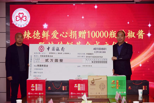 12月18日,辣德鲜爱心捐赠1万瓶辣椒酱暨河南省慈善总会▪辣德鲜基金成立仪式在郑州举行。河南辣德鲜食品企业向省慈善总会捐赠1万瓶辣椒酱,价值8.8万元,同时在河南省慈善总会注入起始资金2万元设立“辣德鲜基金”,践行社会责任,助力中原公益慈善事业。