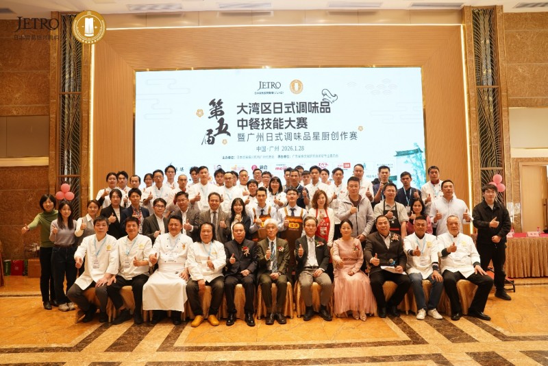 1 月 28 日,由日本贸易振兴机构(JETRO)广州代表处,广东省食文化研究会名厨专业委员会倾力主办的第五届日式调味品大赛,在广州渔旺十八酒楼盛大启幕并圆满落幕。作为深耕中日餐饮文化交流领域的年度标杆盛事,本届大赛延续 “以味为媒、创新融合” 的核心宗旨,汇聚了粤港澳大湾区 32 家知名餐饮机构的顶尖主厨同台竞技,以日式优质调味品为核心纽带,深度探索中餐在风味升级、技法创新、场景适配等方面的多元路径。活动共有21家企业提供了50余款日本品牌的调味品参与,现场不仅吸引了来自广州餐饮行业协会的核心领导、连锁餐饮企业创始人、资深美食媒体人及跨界合作嘉宾近 100 人齐聚,更通过图片直播方式同步向数十万美食爱好者呈现这场兼具技艺比拼与文化互鉴的美食盛会,线上线下热度持续攀升。