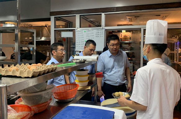 图为执法人员在生产单位后厨检查食品生产加工情况。