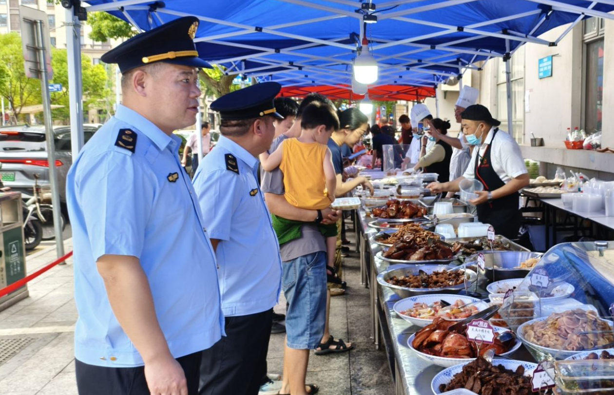 图为执法人员在对餐饮外摆食品进行现场检查。
