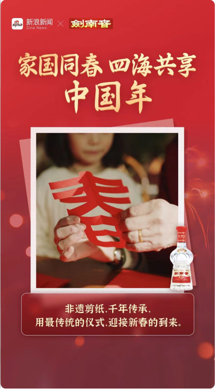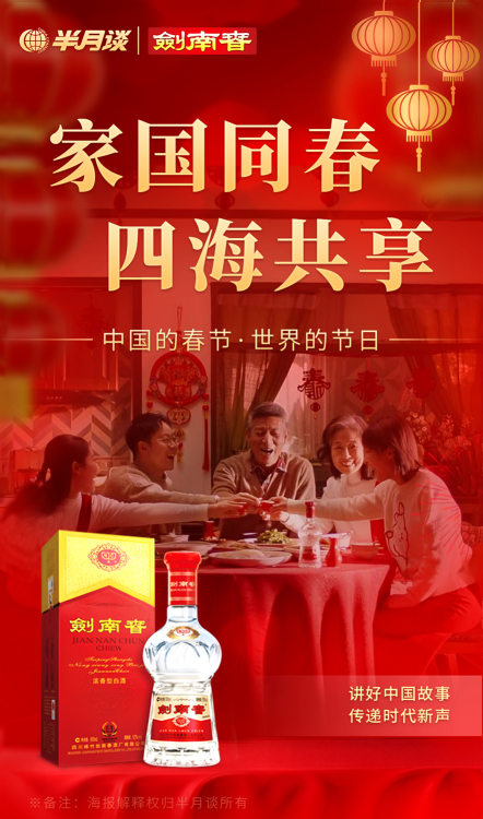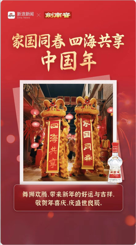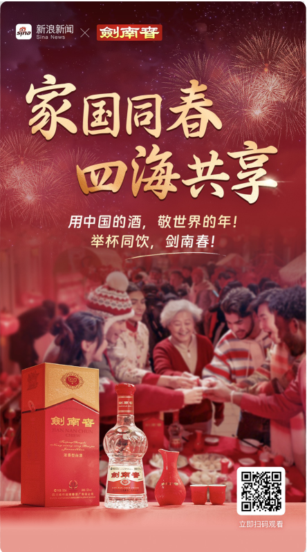 为深度诠释“家国同春·四海共享”这一主题,剑南春携手新浪新闻、微博共同打造《家国同春·四海共享》新春贺岁大片。视频以三杯剑南春美酒为切入点,在“敬酒”与“碰杯”的回响中,细腻勾勒出个体情感、家国情怀与四海共享的理念,交织成一幅新春团圆的画卷。