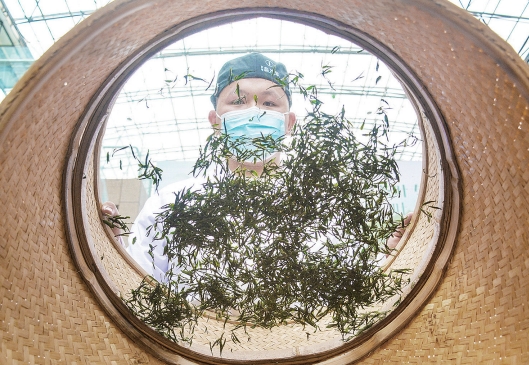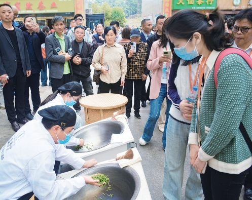 上图为日前于岳西县举行的第四届安徽茶旅大会暨第十七届大别山(安徽·岳西)映山红旅游文化月活动中,制茶师在手工炒茶。右图为制茶师在烘干茶叶。