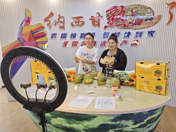 图为近日,在阿瓦提县塔木托格拉克镇库吾尔尕村,“新农人”正在向直播间的观众推介纳西甘甜瓜。