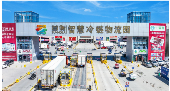 交易中心智慧冷链物流园外,货车等待进场