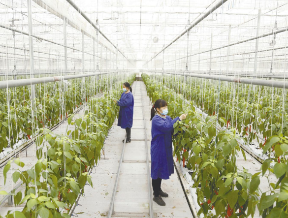 图为近日,在南和区贾宋镇一家现代农业园区,工人在管护辣椒。