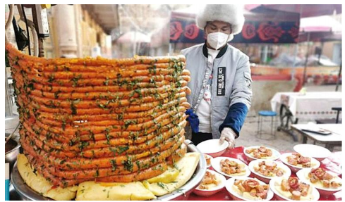 近日,在喀什古城美食街上,商户正给客人准备小吃。 新华社记者刘红霞 摄