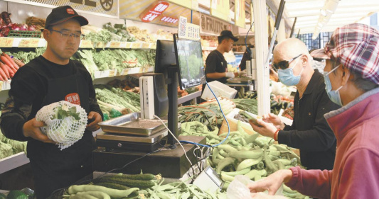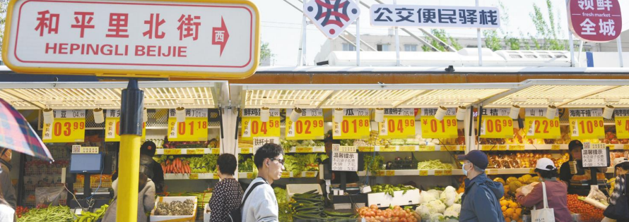 右图为4月18日,市民(右)在位于北京市朝阳区柳芳公交场站东北角的“公交便民驿栈”选购蔬菜。