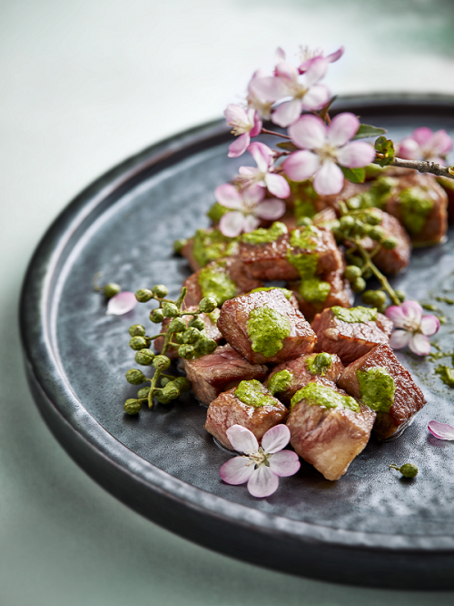 椒麻安格斯雪花小牛肉做水煮牛肉颠覆了以往川菜的形式,打造川菜中的高端品牌。视觉上有种花落门前,繁花簇拥之感。