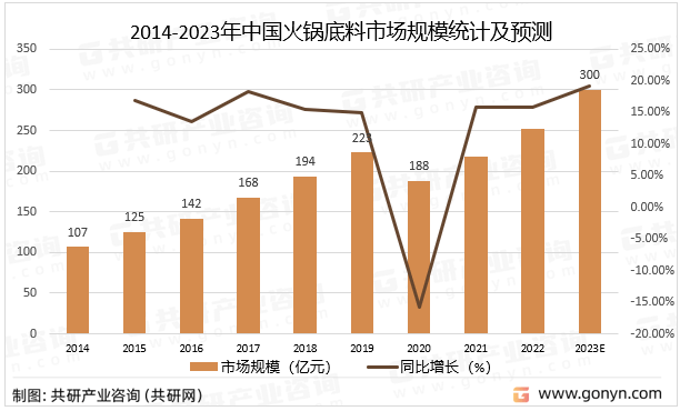 2010年以来,火锅底料行业发展迅猛,2019年受疫情影响,各行各业均受震荡,火锅底料行业却凭借为居家人群提供便捷美味的优势,逆势增长。如今来到后疫情时代,火锅底料整体市场规模不断稳步扩张,相关行业数据显示,2023年市场规模预计将达到300亿。