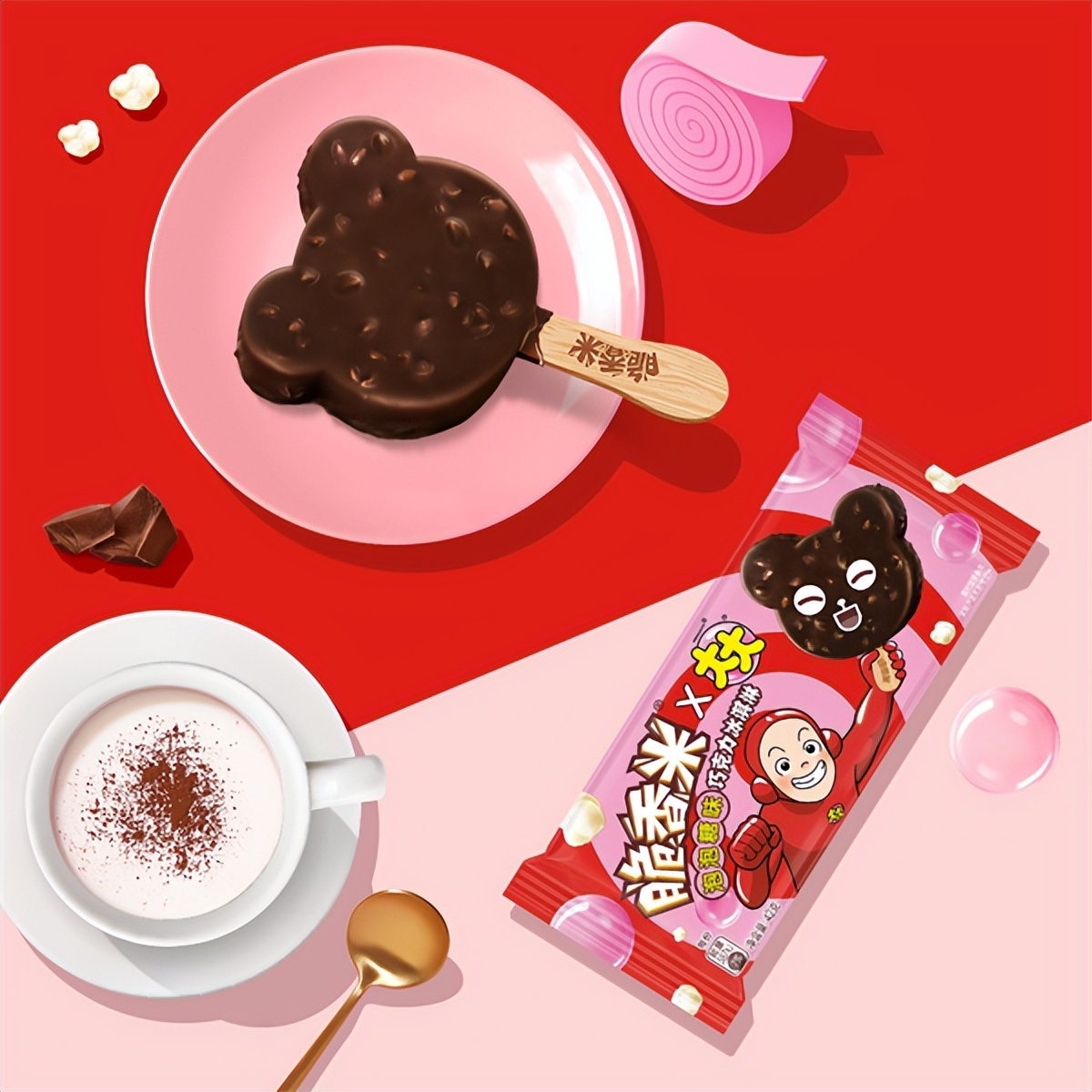 这一经典品牌联名的巧思同样体现在此次冰博会展出的新品上。捕捉到亲子家庭对于情感互动的需求,脆香米®和大大®联名,推出了泡泡糖味巧克力冰淇淋,保留了脆香米®冰淇淋标志性的小熊头形象,为家长与孩子共度亲子时光带来简单、快乐的陪伴。
