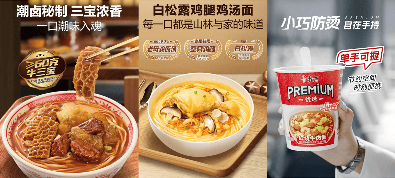 而年轻人的夜宵场景,往往在饱腹需求之外还要爽、治愈等情绪价值,康师傅就用韩式火鸡面、鲜Q面、老母鸡汤面等核心产品,形成了差异化的场景解决方案。