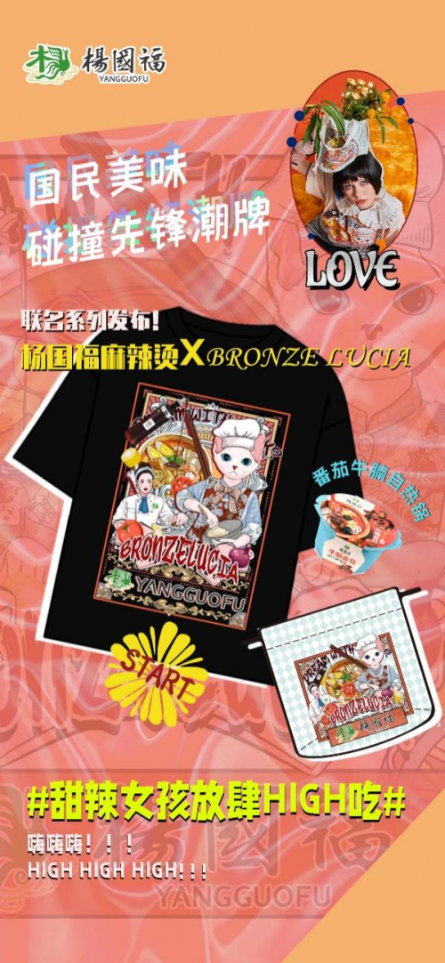 Bronze Lucia作为国潮设计服装品牌,联合国民美味杨国福麻辣烫,充分契合双方的市场定位。Lucia和她的爱猫化身大厨,引领火辣风潮,翻滚着的热气腾腾,动感活力的青春能量呼之欲出。