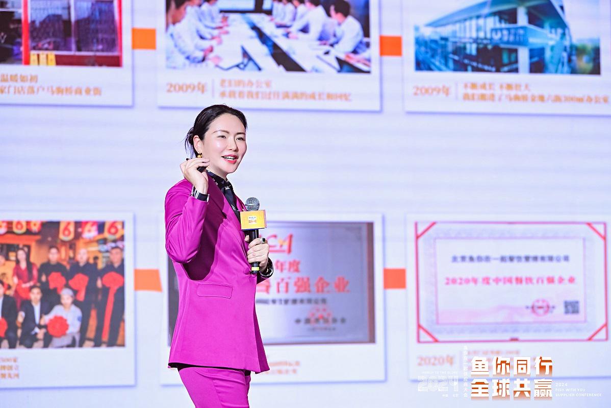 大会上,鱼你在一起创始人魏彤蓉首先致辞,感恩各位供应商伙伴的长期同行,2023年,鱼你在一起以全球门店数量超2300家的成绩,稳居酸菜鱼品类第一,这离不开各位供应商从后端给予的大力支持。面对行业趋势变化及万店战略目标,魏总提出“千亿大赛道,爆品很上瘾,优质又平价,标准化出品”的产品策略口诀,明确推进产品从酸菜鱼大单品向天花板更高的“1+N”中式快餐爆品组合升级,提升供应链、数字化与专业化管理的赋能力度。