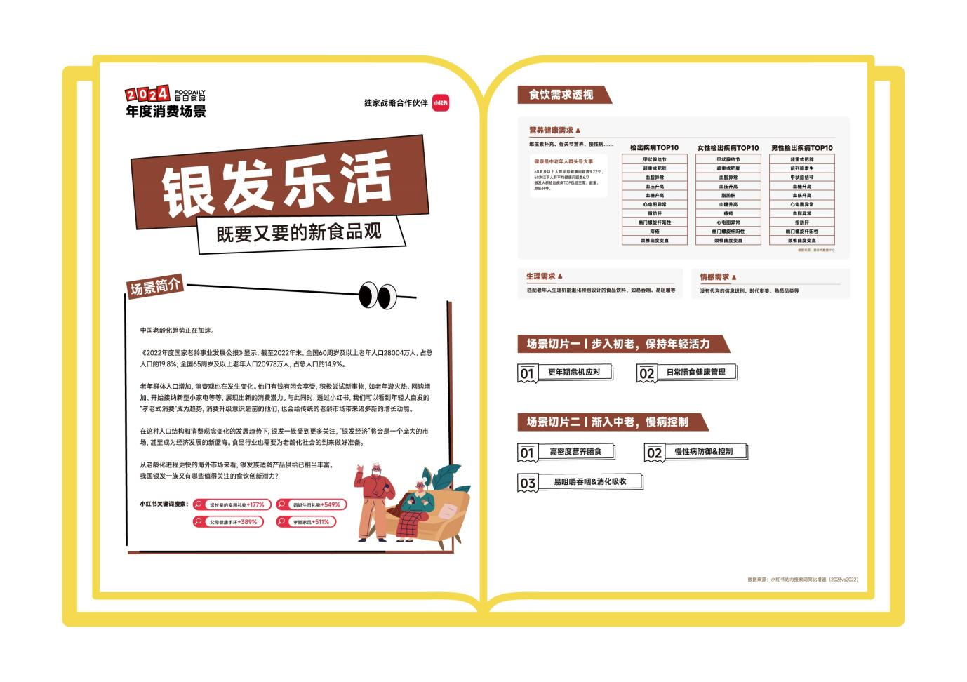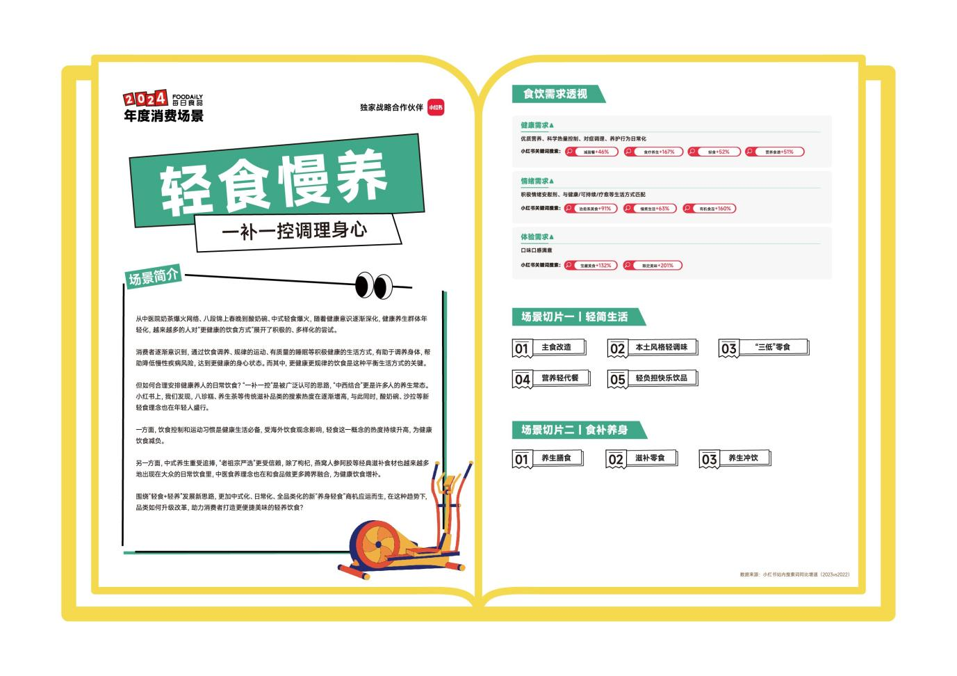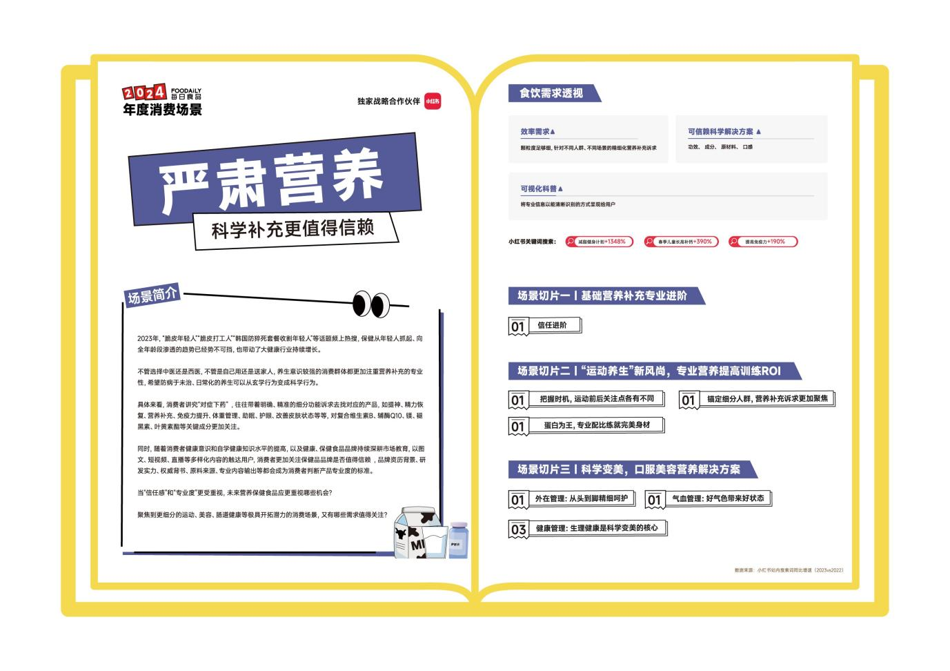 4、不确定的大环境,健康成为各年龄层最确定的指标。我们观察到当下消费者在健康生活方式的演绎上,呈现出两种消费场景,一种是轻食慢养,就是把健康饮食观念渗透日常,小红书上“轻食” ”酸奶碗” “减脂主食” “食疗养生” “养生茶”等关键词均呈现搜索上涨趋势;另一种是严肃营养,以功效性、科学性为主导,口服营养在更多健康领域被关注,比如女性生理健康、头发等。