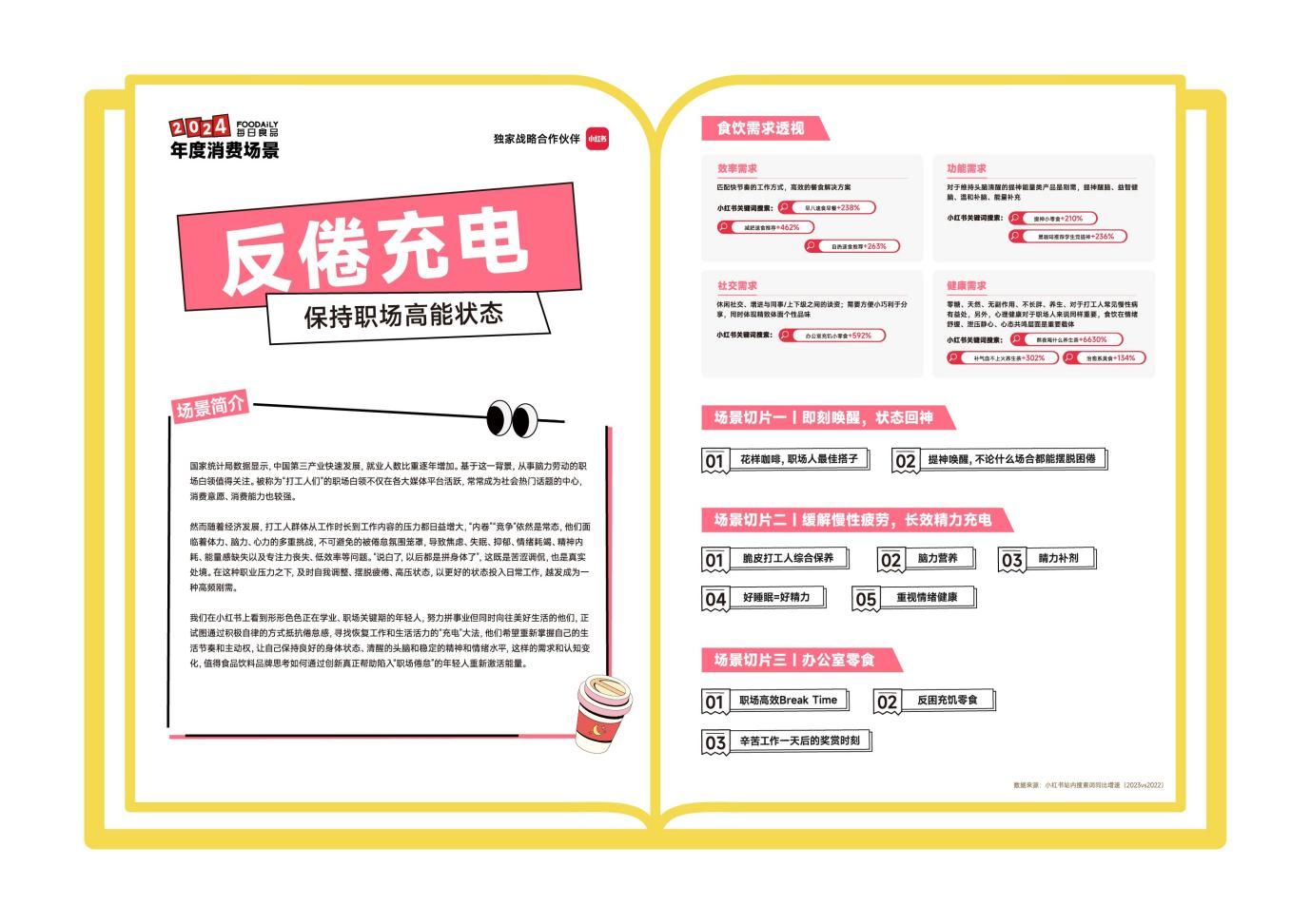 如增长高达6114%的“露营美食清单”,以及“职场打工人续命神器”“犯困怎么提神“等小红书搜索关键词,和#吃了甜食会开心等小红书上的话题,都可以看到户外、打工人职场充能、情绪发泄&情绪舒缓等场景下增长的品类需求。