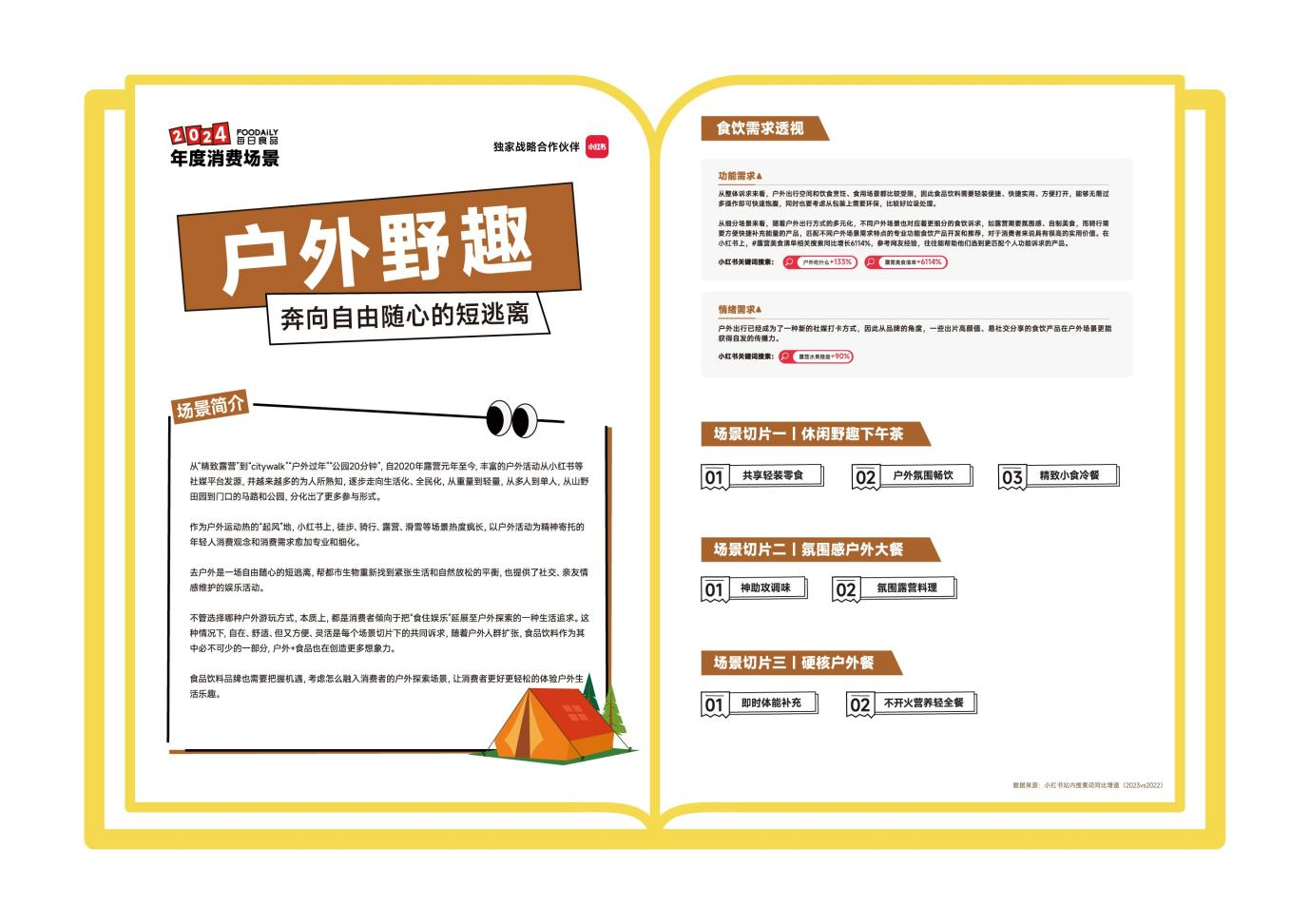 而小红书这样的独特社区内容场域,聚集了1.8亿爱美食、爱分享、爱追随趋势和创造趋势的食饮用户,大量用户基于真实体验自发分享的内容,以及在用户和内容的共同传播推动下产生的食饮行业新趋势灵感,不仅帮助品牌发现更多场景营销新契机,同时作为众多年轻食饮用户青睐的“美食灵感指南”,徒步、下午茶、夜宵、聚餐等新食饮场景与零食、甜品、速食、调料等越来越多品类相互碰撞,激发美好生活联想,促成消费需求增量。