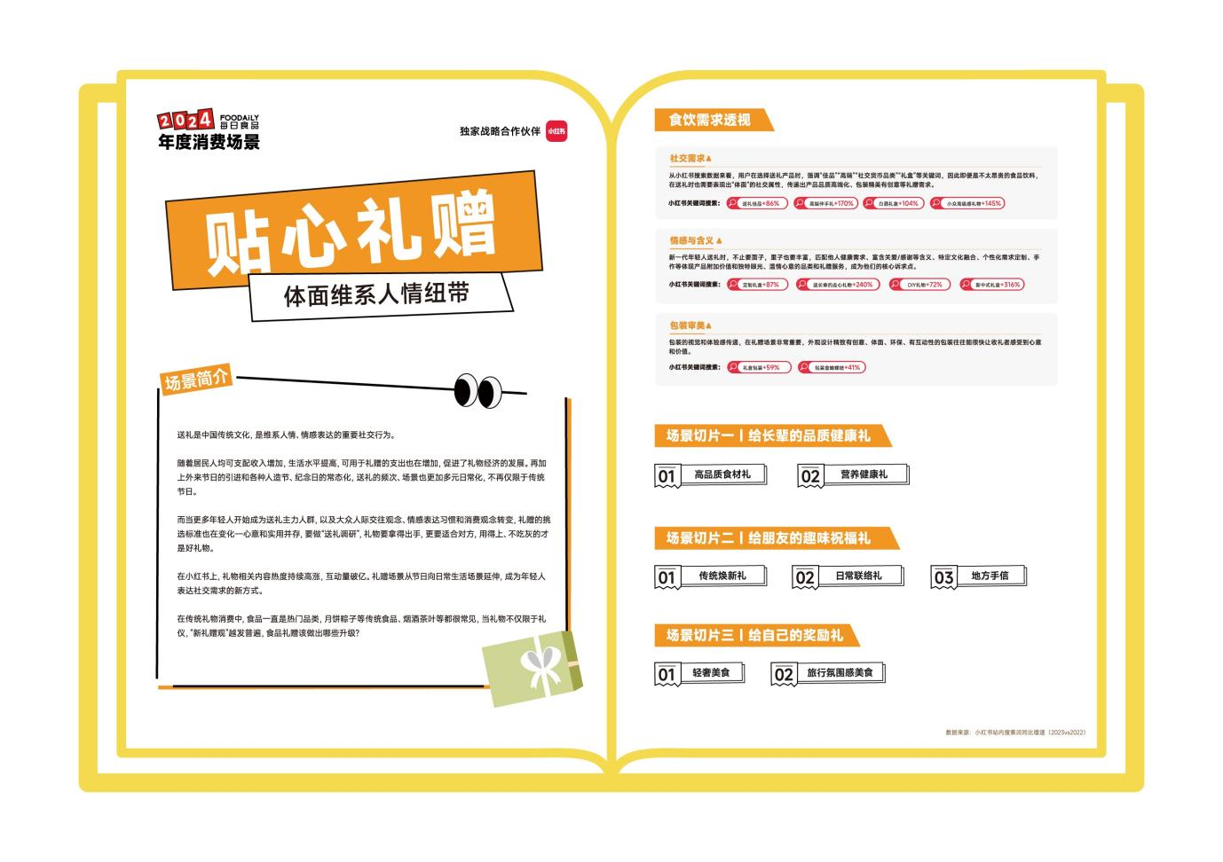 3、社交关系的变化带来新的食饮场景需求,当代人在构建新的过节体系,体验型社交消费受到关注,聚会型食品饮料、主题定制型食品饮料会逐渐成为趋势,如在小红书,”看球赛必备美食“搜索关键词增长735%。此外,传统的送礼文化伴随着更多年轻人成为主力人群,在人际交往、情感表达方面更加日常化,而食品饮料是表达日常新意的重要载体,一些具备新奇特、健康感、文化认同感的品类,如烘焙点心、土特产等,成为新兴送礼品类。