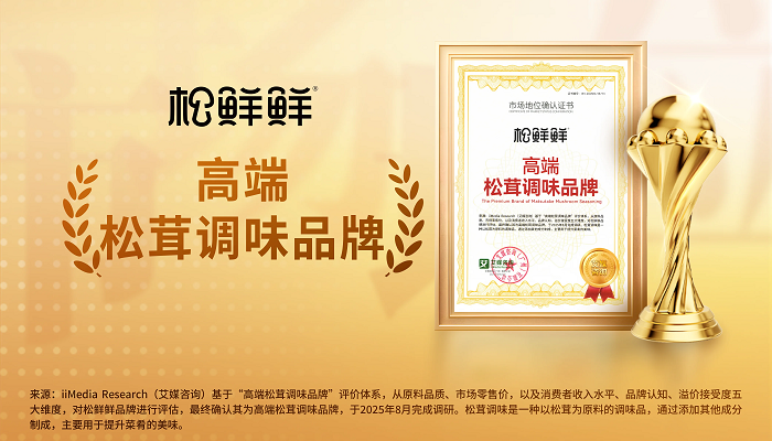 近日,松鲜鲜获全球领先的新经济产业第三方数据挖掘和分析机构iiMedia Research(艾媒咨询)授予的“高端松茸调味品牌”市场地位确认。