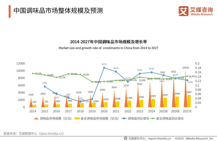 iiMedia Research(艾媒咨询)数据显示,2024年中国调味品整体市场规模已达6871亿元,同比增长16.0%;其中2024年中国复合调味品市场规模达2301亿元,值得关注的是,作为复合调味品的细分赛道,松茸调味料市场正呈现爆发式增长——2023-2025年复合年均增长率高达134.6%,预计2025年市场规模将达15.47亿元。