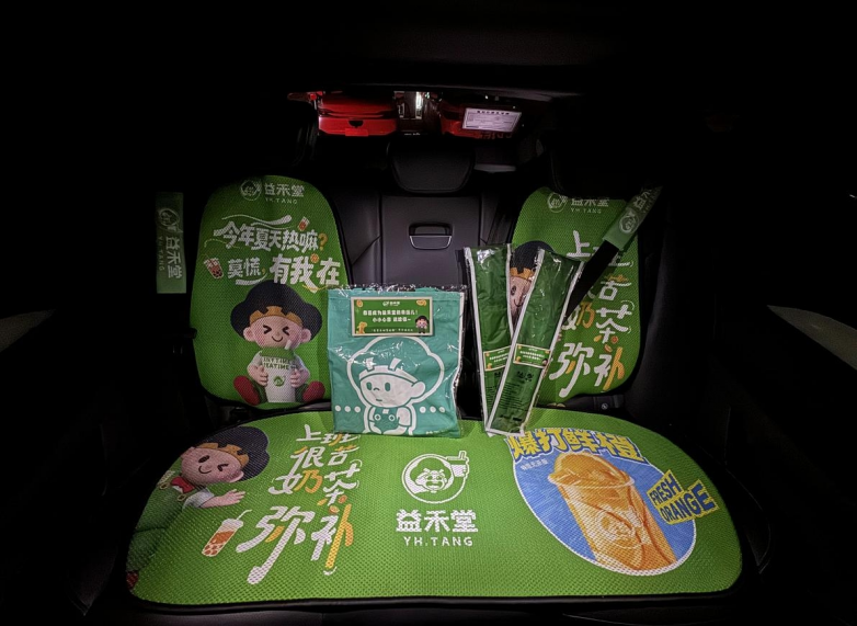 车身整体以益禾堂明星产品“爆打鲜橙”为主题进行视觉包装,醒目且具有强烈辨识度,车辆行驶过程中形成流动广告效应,极大提升了品牌曝光频次与视觉冲击力。车内还随机放置了益禾堂定制周边产品,乘客在体验无人驾驶科技的同时,也有机会收获来自益禾堂的惊喜礼物,增强了品牌与消费者之间的情感链接。此外,益禾堂品牌IP“堂堂”也以人偶形象现身自动驾驶舱,通过拟人化、场景化的互动设计,进一步拉近与年轻群体的距离,传递出“好玩、会玩”的品牌形象。