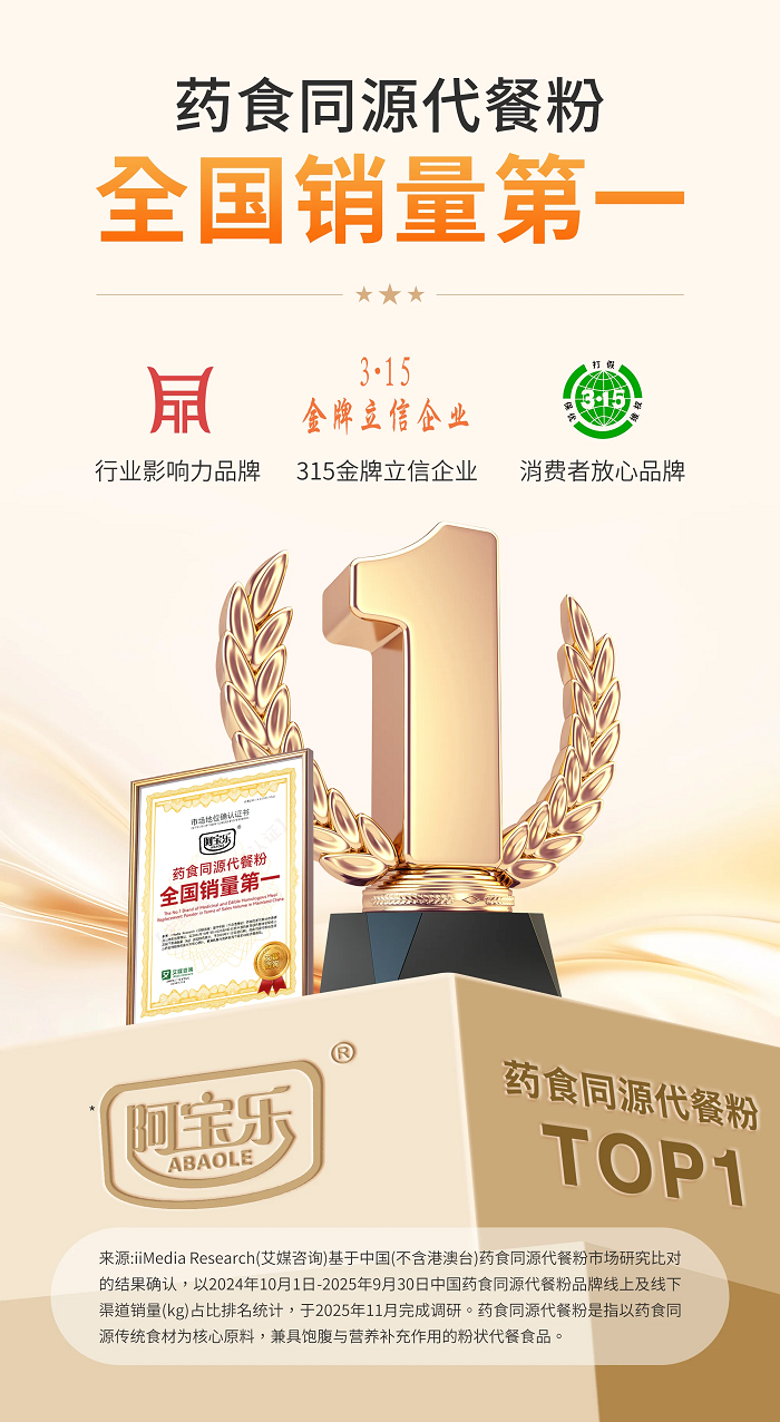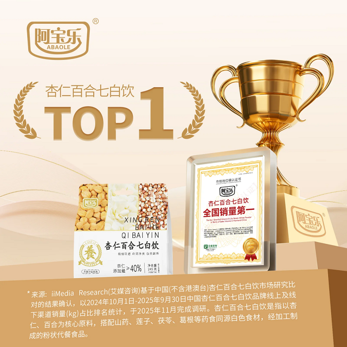 2025年11月,阿宝乐荣获全球领先的新经济产业第三方数据挖掘和分析机构iiMedia Research(艾媒咨询)授予的“药食同源代餐粉全国销量第一”“杏仁百合七白饮全国销量第一”市场地位确认。