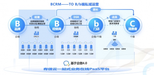 有信云BCRM是基于企业微信生态构建的toB私域运营体系。依靠企微4.0将“连接”做到极致,打通上下游高效,实现一个平台,一个入口连接经销商、DSR、门店,赋能品牌精细化运营经销私域,赋能经销精细化运营门店、消费者私域,将彼此的关系线上化,实现toB运营toC化,并且真正做到全渠道数字化。